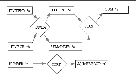 A dataflow graph is a finite, connected, directed, bipartite graph with one set of nodes called concepts, and the other set of nodes called actors. If an arc is directed from a concept c to an actor t, then the arc is called an input arc of t, and c is called an input concept of t. On the other hand, if an arc of a dataflow graph is directed from an actor t to a concept c, then the arc is called an output arc of t, and c is called an output concept of t. Every actor must be attached to at least one arc (either input or output). The arcs of a dataflow graph are drawn as dotted lines to distinguish them from the arcs of conceptual graphs. The concepts are still drawn as boxes, but the actors are drawn as diamonds. Consider the dataflow graph in Figure 1. There are three actors: <DIVIDE>, <PLUS>, and <SQRT>, and six concepts: DIVIDEND, DIVISOR, QUOTIENT, REMAINDER, SQUARE-ROOT, and SUM (all are subtypes of NUMBER; they are role types, which represent a particular way of using the natural type NUMBER). The actor <DIVIDE> has input concept *a of type DIVIDEND and *b of type DIVISOR, and output concept *d of type QUOTIENT and *e of type REMAINDER. The actor <SQRT> has [NUMBER: *c] as input and [SQUARE-ROOT: *f] as output, and <PLUS> has *d and *f as input and [SUM: *g] as output. In conventional programming language, the following statements would generate the same results as this dataflow graph: