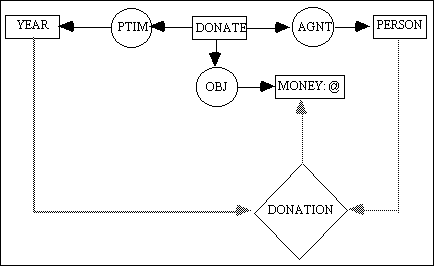 schema for DONATE (x) is v [DONATE: *] - (AGNT) -> [PERSON] (OBJ) -> [MONEY: @] (PTIM) -> [YEAR]and the following dataflow graph: