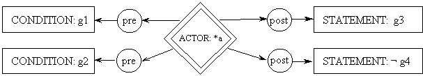 The graph of Figure 5 states that actor *a will be triggered (will fire) if, from the current state of the system, graphs g1 and g2 are both true (are logical consequences of the actual state of the system). In this case, two assertions will be made: g3 will be asserted and g4 will be negated (i.e., ¬g4 will be asserted). Of course, there may be problems with this state transition: g3 may not be valid according to the semantic constraints of the system2. Also, this may trigger thorough knowledge revision activities: g4 may not be easily negated (because of previous assertions and stated rules)3. In that case, the actor is blocked and the user is notified. It may also be the case that an actor does not change the current state of the system (if g3 is already true and g4 already false for instance).