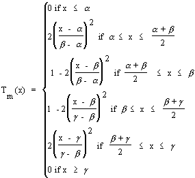 A number of FESs have been successfully implemented to-date. Examples of these can be found in Adlassnig et al. (1985), Binaghi et al. (1993), Fathi-Torbaghan and Meyer (1994), Gisolfi and Di Lascio (1995), Hwang (1995), Daniels et al (1997) and Martínez-Béjar et al. (1997a). Some of the quoted systems use gausssian models for defining membership functions (Zadeh, 1983). These are particularly interesting when the usual values given to the fuzzy terms employed by experts can be represented by means of a triple (T) such as <low, medium, high>, <short, medium, high>, etc. We will term to each component of T as Tl, Tm, and Tr, respectively. Given a triple T, the formal definition of the mentioned functions is the following: