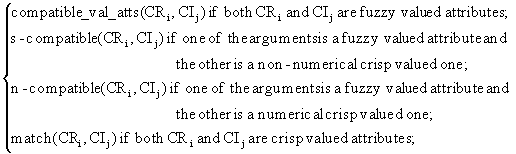 Ç I ¹ f .In the particular case of FROCH-based systems, given the knowledge representation schema adopted in this article, the calculation of both Dinput and Dcornerstone must be done according to the compatibility criteria (by assuming that there can be fuzzy valued attributes involved in such an schema) pointed out before. In the following lines, and by taking into account previous definitions, this issue is analysed in depth