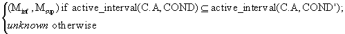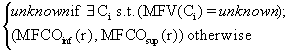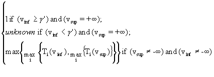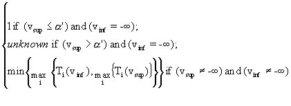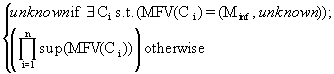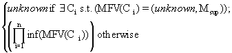 At this point, it is possible to obtain a membership function value for a conclusion in a certain rule by taking into account all the membership function values of the condition(s) in the antecedent of such a rule. For it, it can be noticed that three possible types of value for MFV have been considered, namely, numeric ones, interval-based ones and those equals to "unknown". With all, by using the above assumptions and the notation employed before, a formula to propagate fuzzy values from antecedent to consequent parts in a rule is proposed in the following.